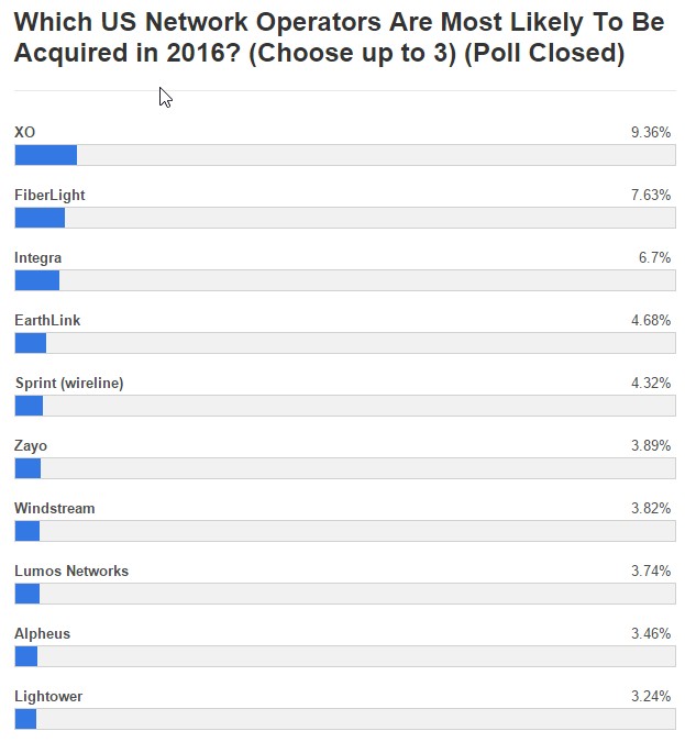 XO won the title as most popular consolidation target as it always does. But it had to come from behind, as both FiberLight and Integra led the poll for several days. The pair are two of the last independent supra-regional fiber providers. EarthLink and Sprint’s wireline business are logical enough national targets, while Lumos and Alpheus have regional depth that could be of interest to an acquirer. But Windstream as a target? Hmmmm… And somehow serial network asset buyers Zayo and Lightower made the top 10 as consolidation targets, yet it doesn’t seem like the multiple would cooperate and who would be the buyer? Let’s look to the other poll for answers to that question.
