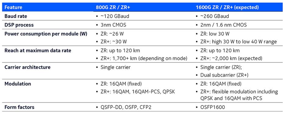 Table 1: Comparing 800G ZR/ZR+ and 1600G ZR/ZR+ coherent pluggables